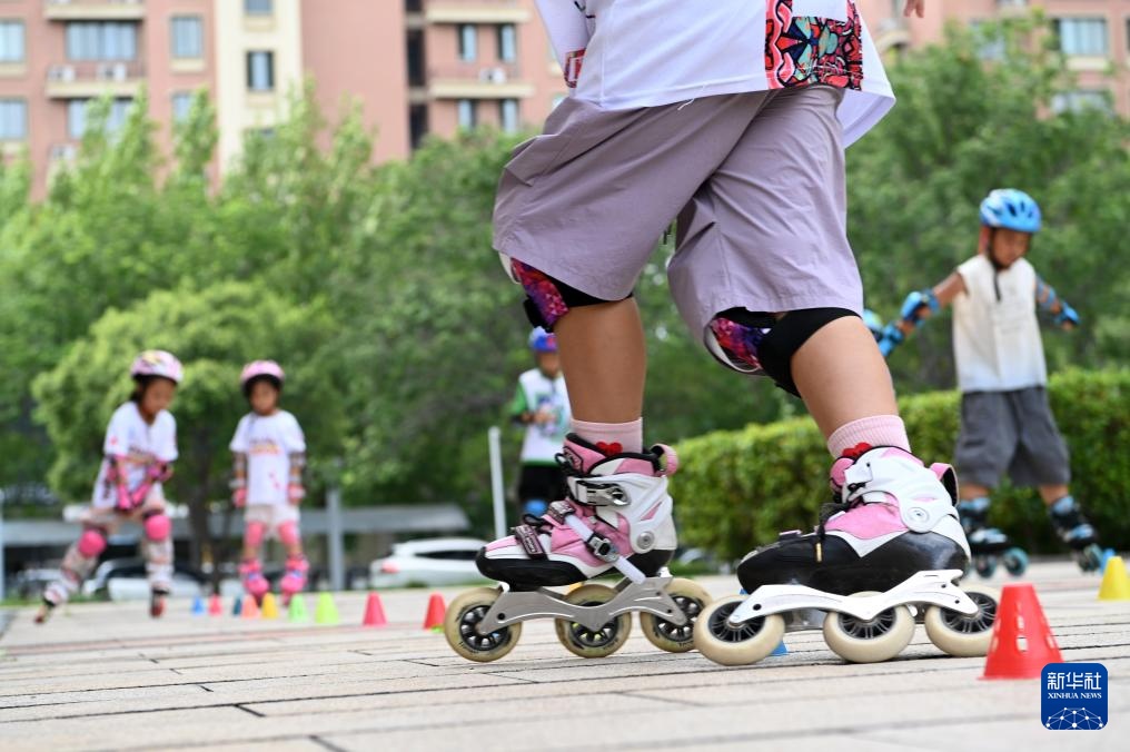 7月25日,在河南省沁阳市文化艺术中心,小朋友练习轮滑。