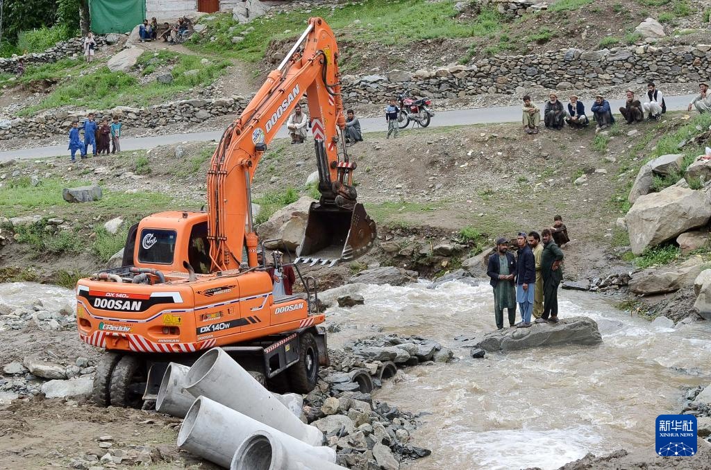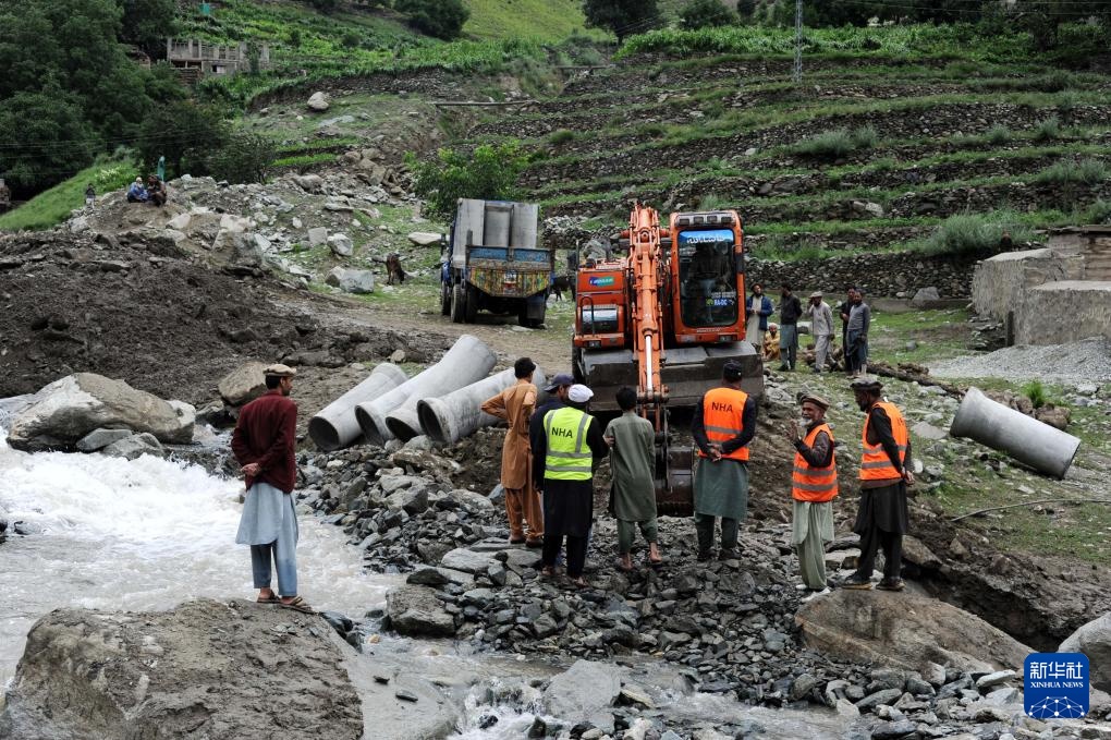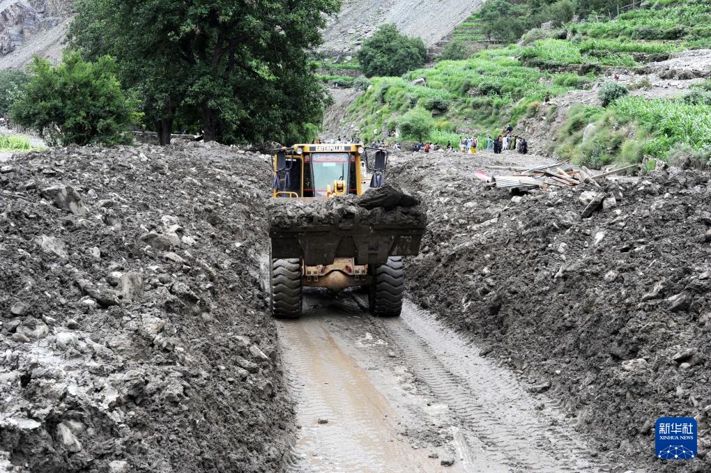 7月24日,在巴基斯坦北部吉尔吉特-伯尔蒂斯坦地区的齐拉斯附近,救援人员清理受暴雨洪水影响的道路。