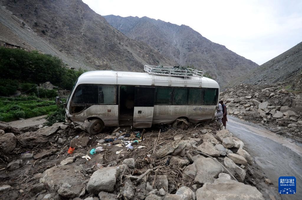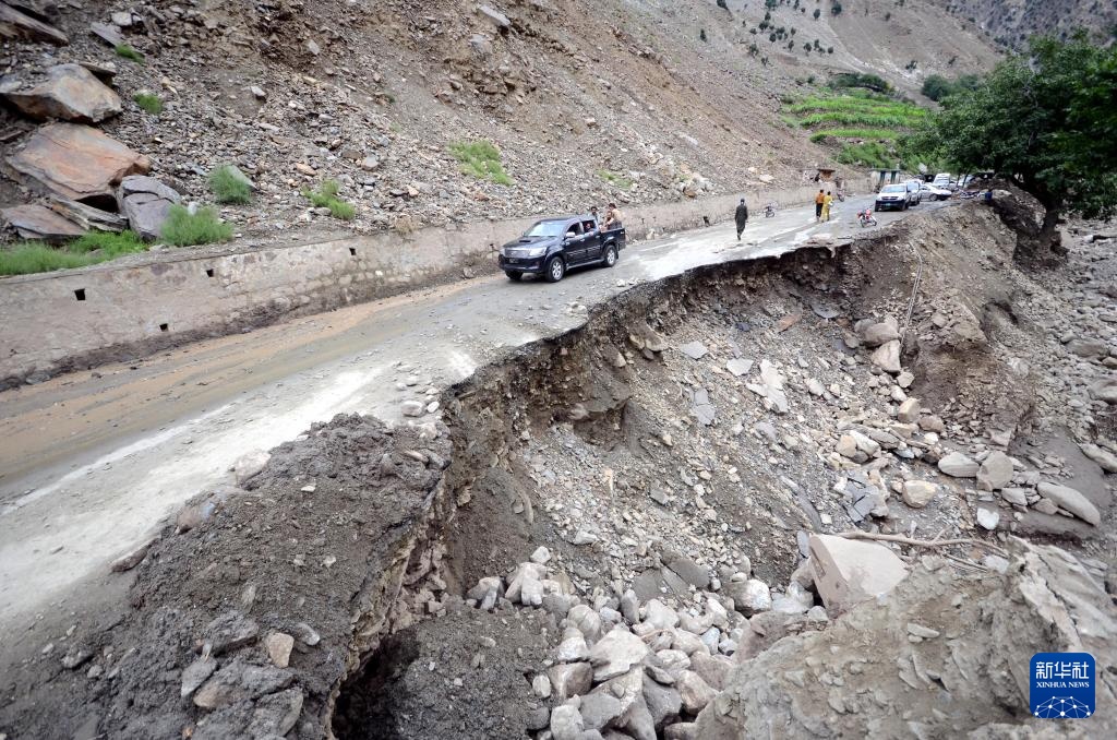 这是7月24日在巴基斯坦北部吉尔吉特-伯尔蒂斯坦地区的齐拉斯附近拍摄的受暴雨洪水影响的道路。