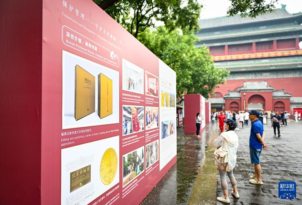 7月27日,人们在北京钟鼓楼广场上观看介绍北京中轴线申遗成功一周年成果的展板。