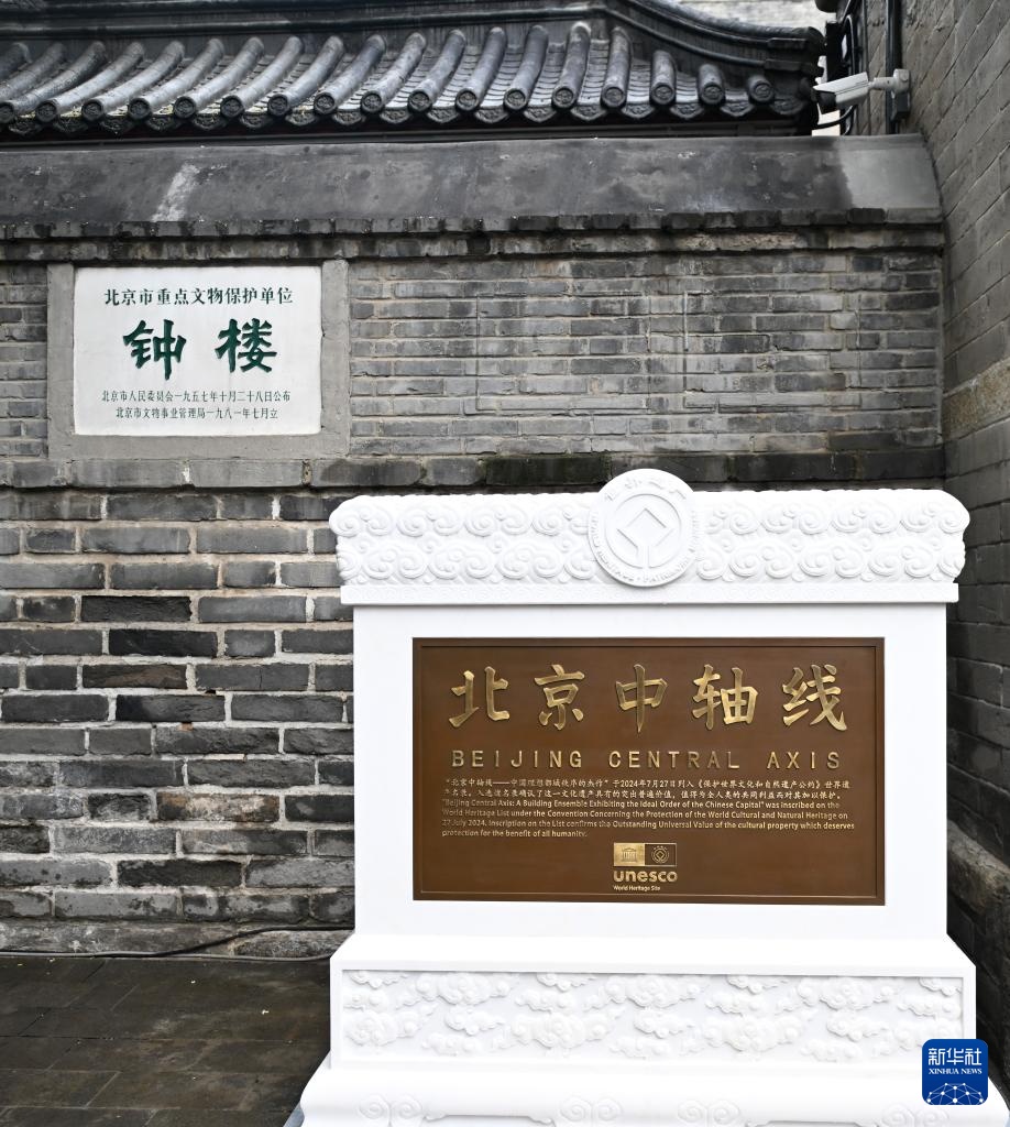 这是7月27日在北京钟楼前拍摄的北京中轴线世界文化遗产标志碑。