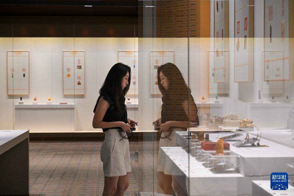 7月27日,观众在故宫文华殿欣赏篆刻作品展。