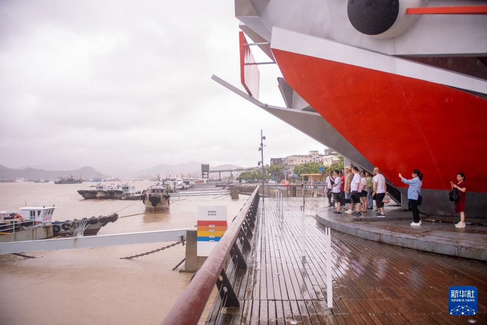 7月29日,游客在宁波市象山县石浦港游览时避雨。