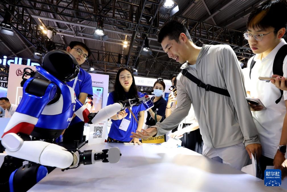 7月29日,参观者在观赏一款可用于零售、工业等多种场景的机器人。