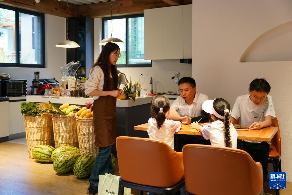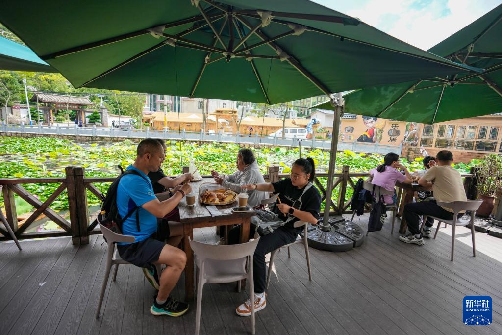 7月27日,游客在乐居村九犀面包店内品尝面包。