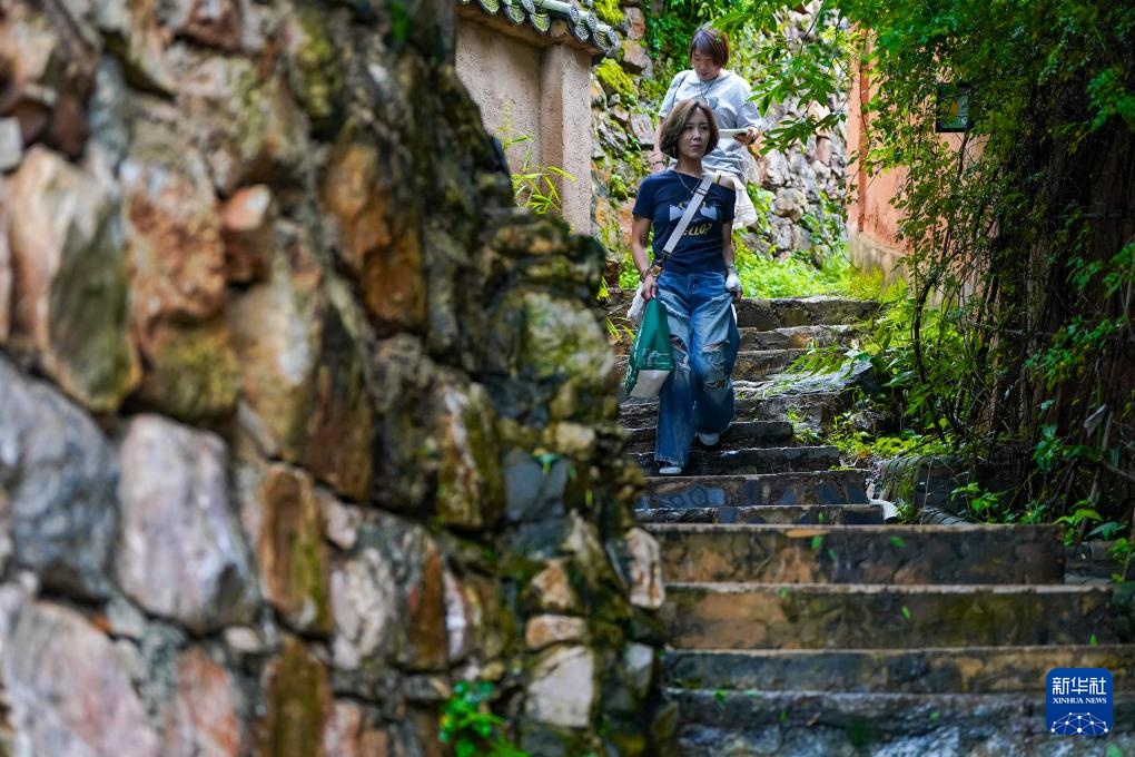 7月27日,两名游客在乐居村游玩时经过村内菜市场。