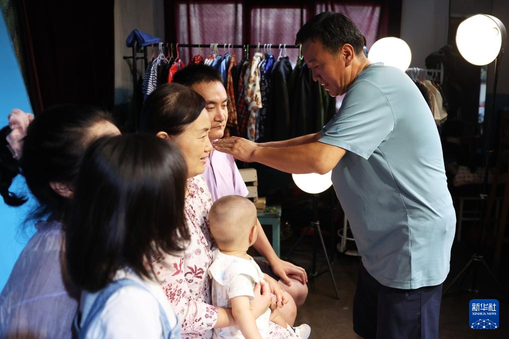 7月29日,魏伟(右一)在阿干照相馆里挪动背景板,准备为几位专门赶来拍照的西安游客拍摄全家福。