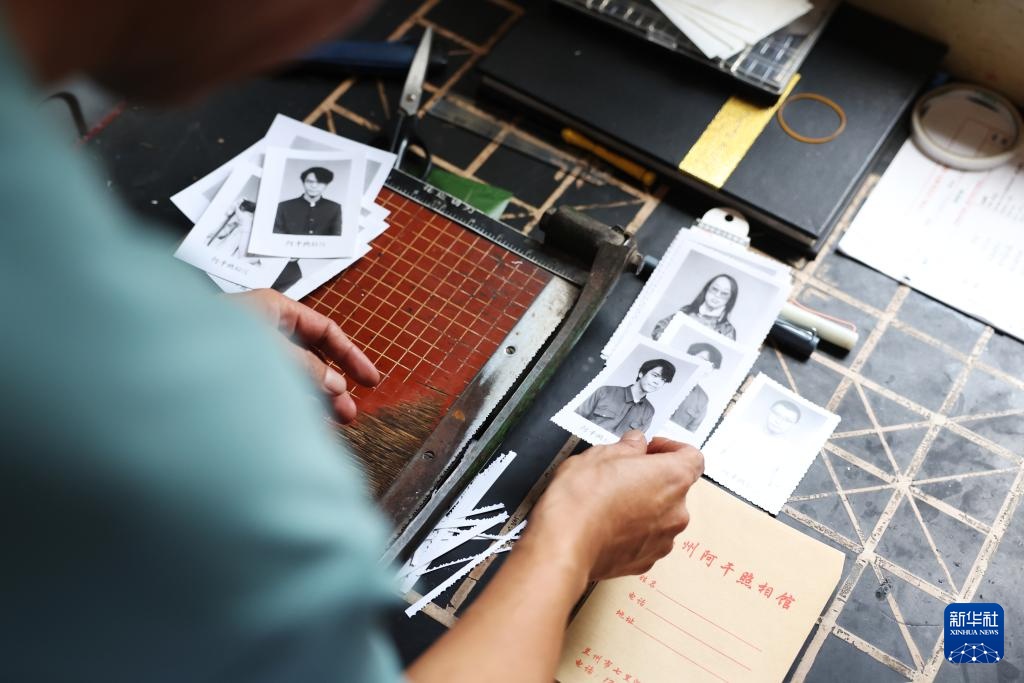 7月29日,魏伟在阿干照相馆里裁切照片。