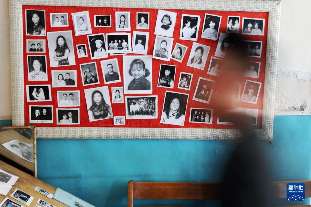 7月29日,一位慕名前来拍照的游客从阿干照相馆的一面照片墙前走过。
