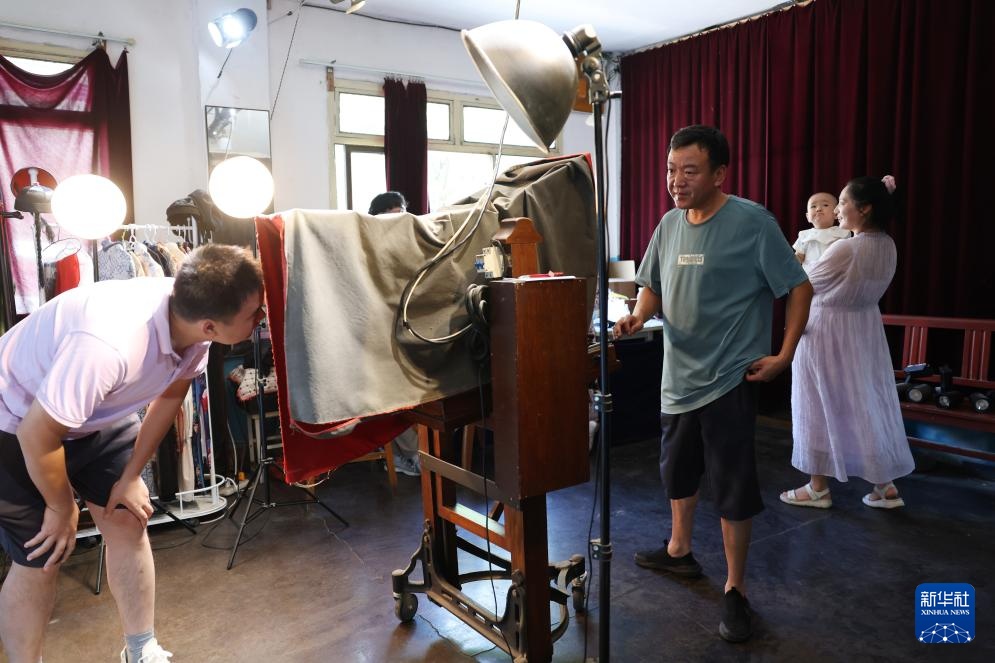 7月29日,魏伟在阿干照相馆里准备为几位专门赶来的西安游客拍摄全家福。他的大画幅相机吸引了顾客的目光。