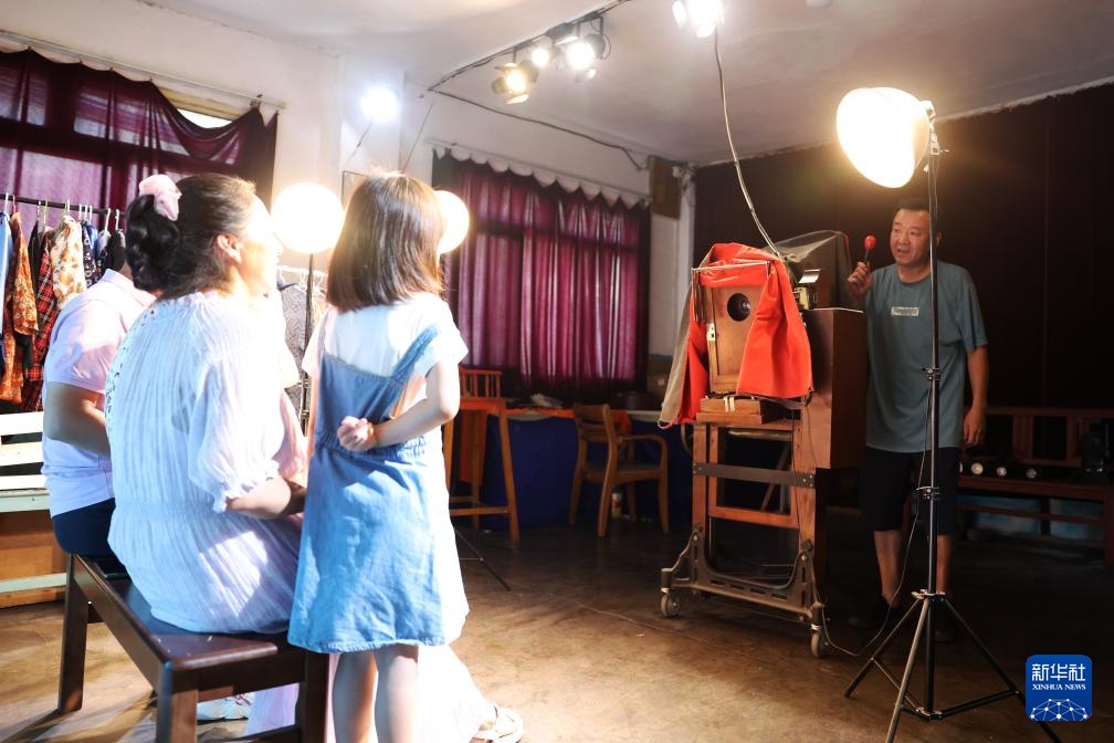 7月29日,魏伟在阿干照相馆里为几位专门赶来的西安游客拍照。