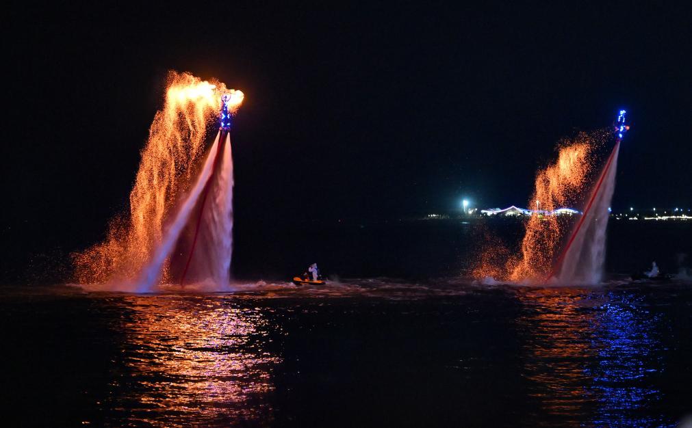 这是8月2日拍摄的欢乐节开幕式现场的水上表演。