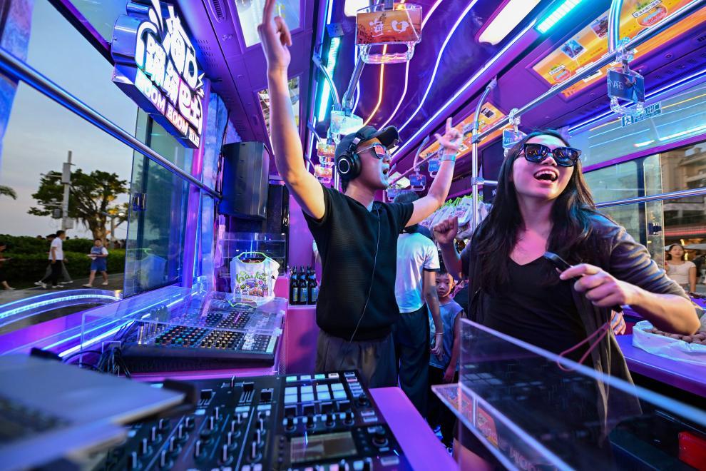 8月2日,市民和游客在欢乐节开幕式现场的“蹦蹦巴士”上游玩。