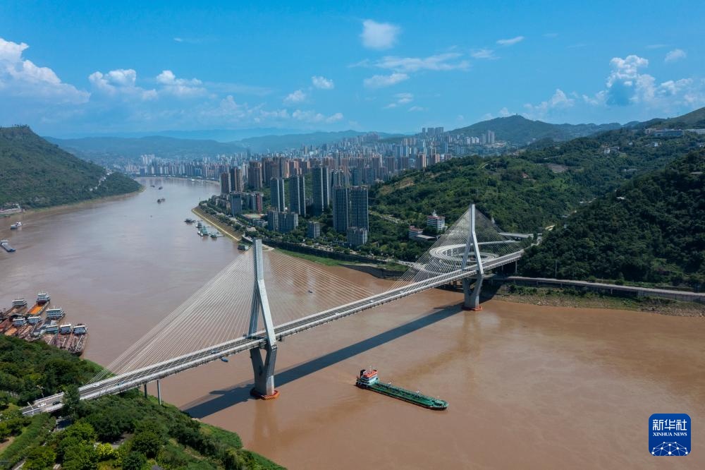 7月30日,一艘在长江上航行的集装箱货轮准备从重庆市涪陵区涪陵长江大桥下穿过(无人机照片)。