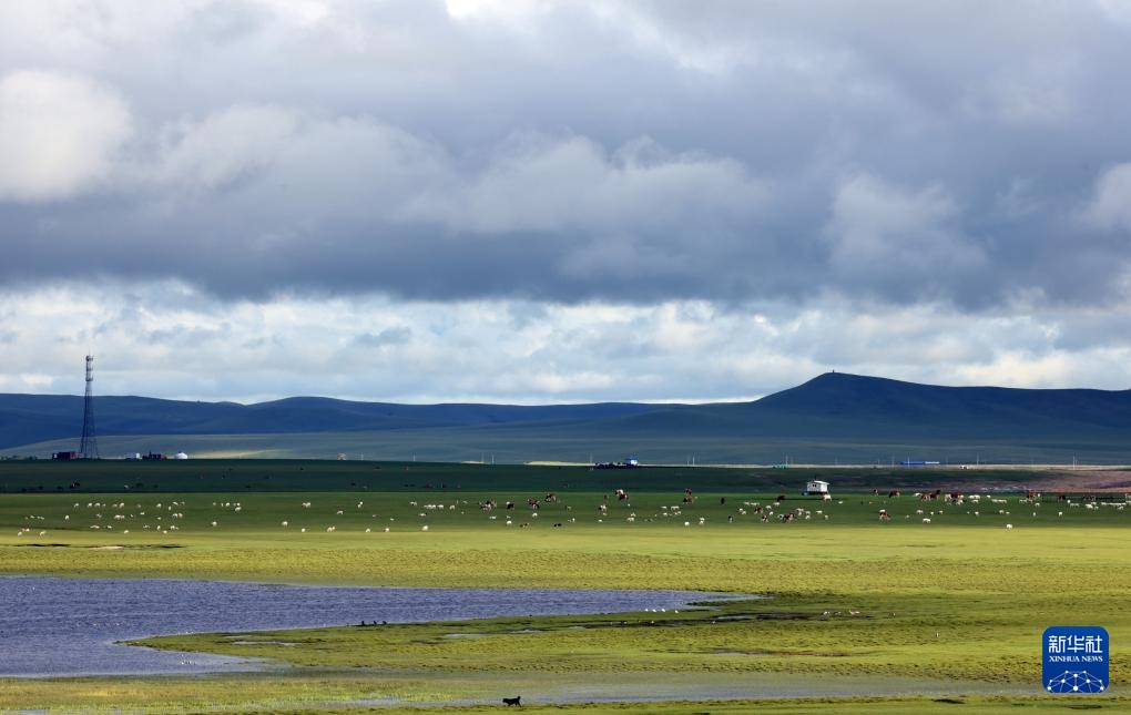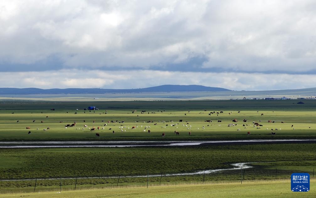 8月2日,牛羊在呼伦贝尔草原上觅食。