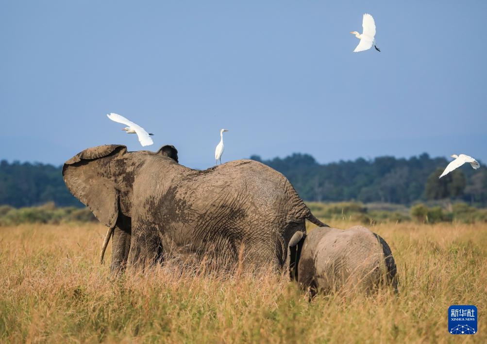 7月30日,在肯尼亚马赛马拉国家保护区,大象和鸟类互动。