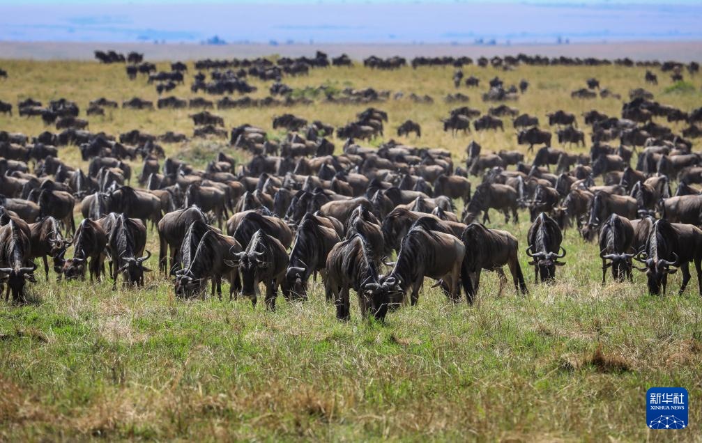 7月31日,在肯尼亚马赛马拉国家保护区,成群的角马在草原上觅食。