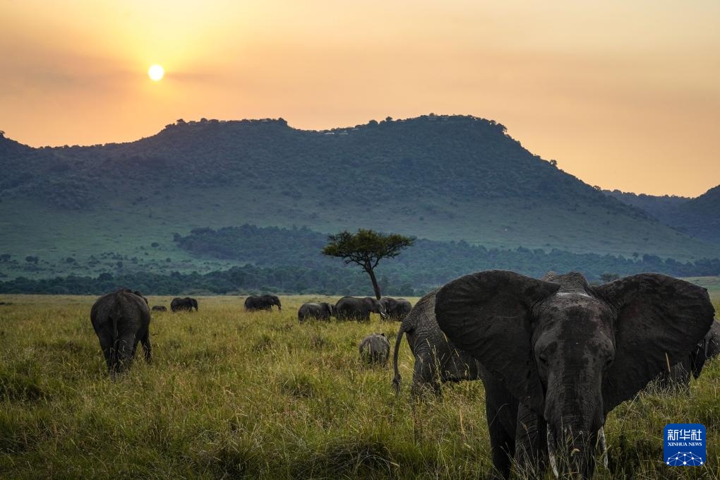 7月29日,在肯尼亚马赛马拉国家保护区,大象在日落时分走过草原。