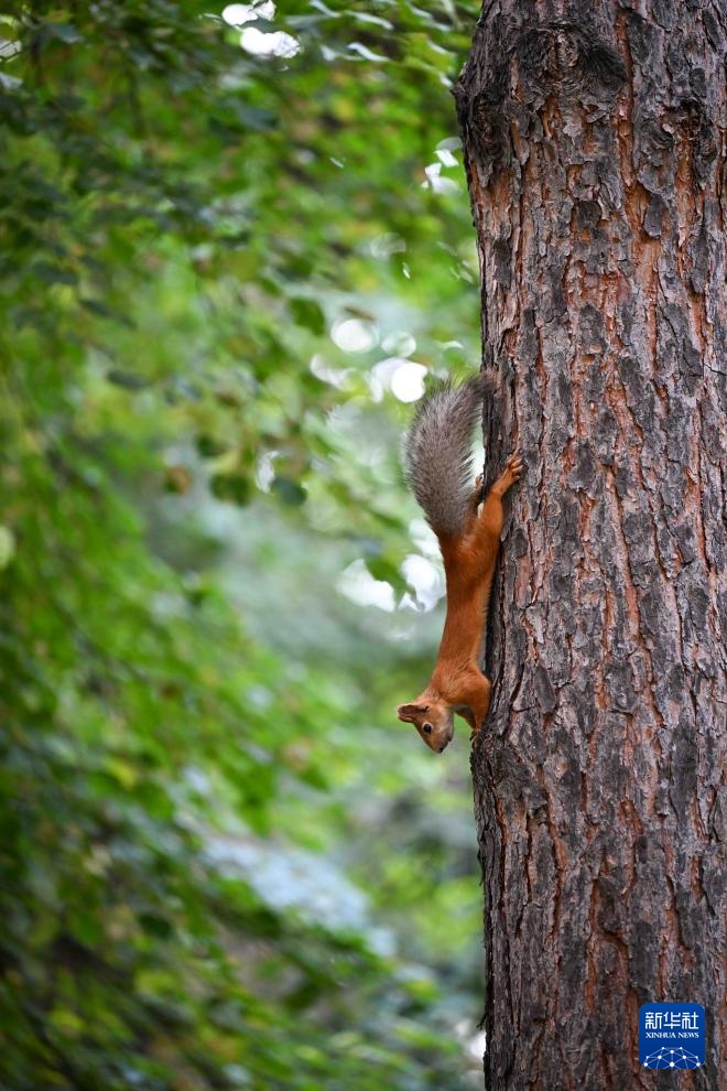 这是8月3日在哈萨克斯坦阿拉木图一个公园拍摄的松鼠。