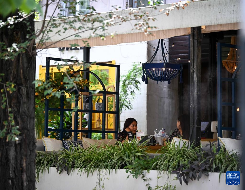8月3日,在哈萨克斯坦阿拉木图,人们在一家咖啡馆休闲聊天。