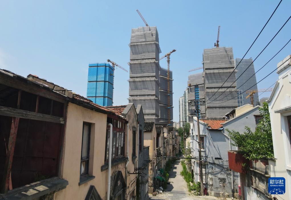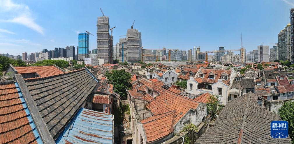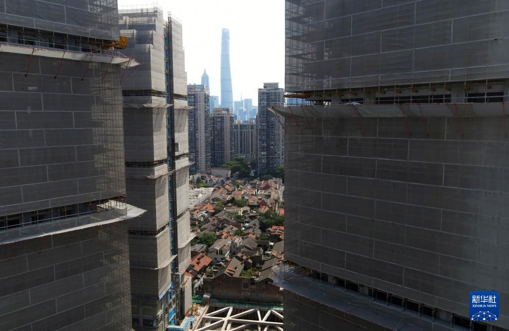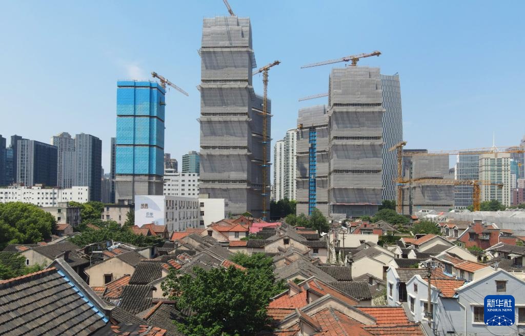从一片待改造的老房子远眺上海黄浦区508-514街坊地块旧城区改造一期项目建设中的楼房(7月15日摄,无人机全景照片)。
