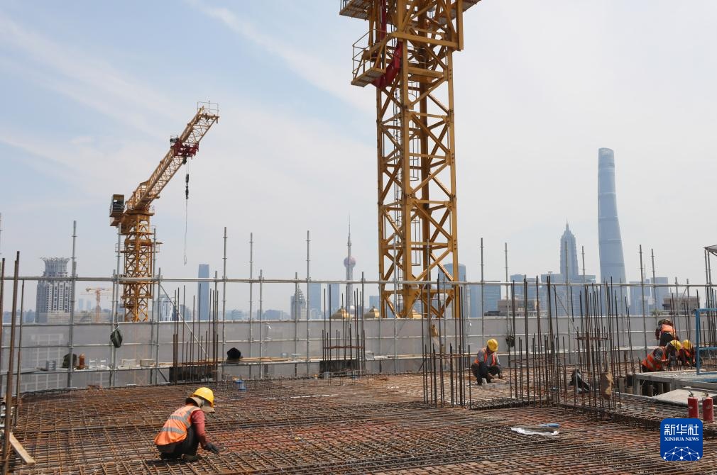 7月15日,建筑工人在上海黄浦区508-514街坊地块旧城区改造一期项目一幢楼房屋顶进行钢筋捆扎作业。