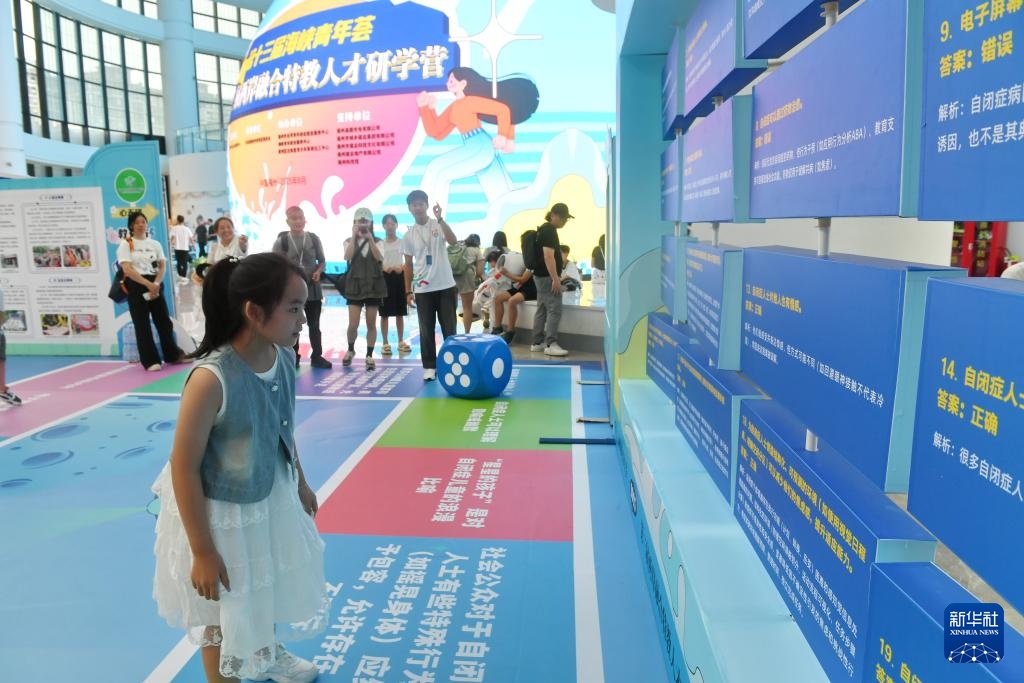 8月5日,福州市科技馆的小观众通过现场互动闯关游戏学习心智障碍相关知识。