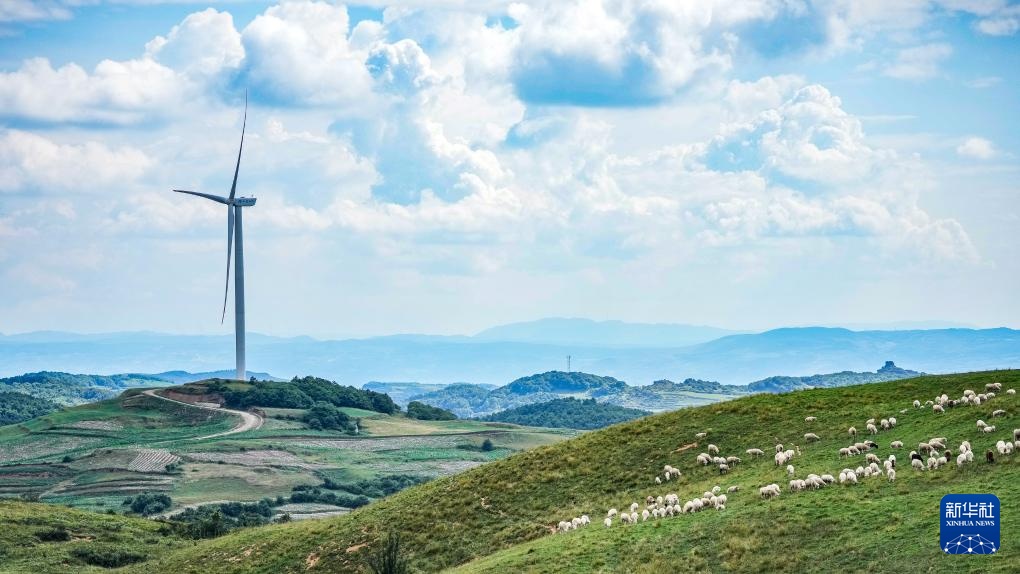 威宁彝族回族苗族自治县雪山镇村民饲养的羊群在风力发电设施下的草场吃草(2023年7月13日摄)。