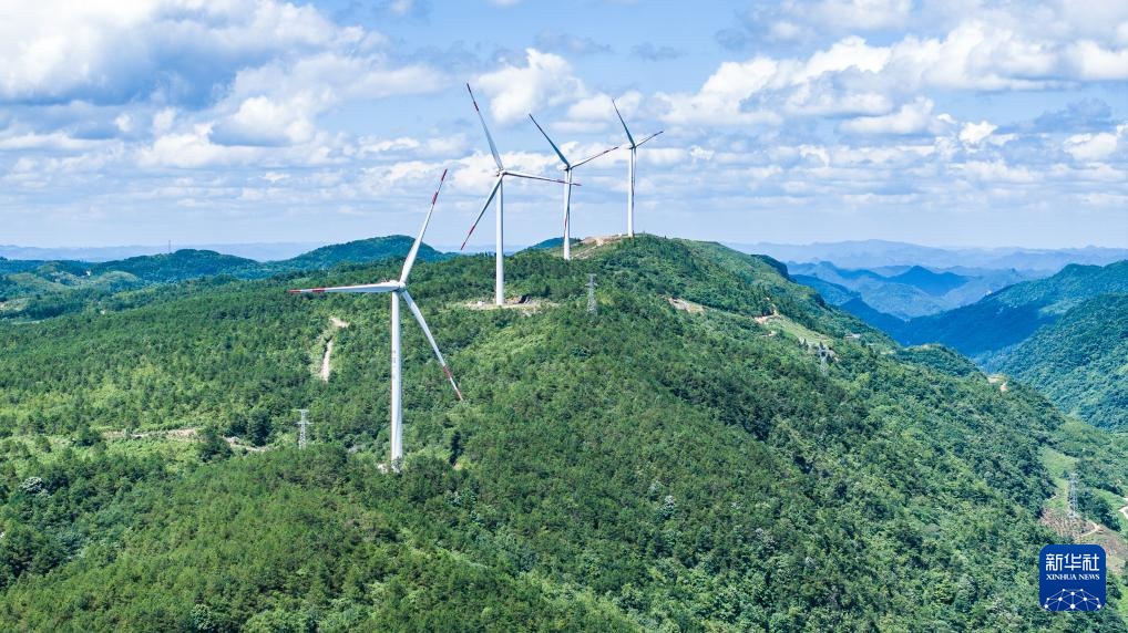 位于六盘水市钟山区梅花山的风力发电设施(7月3日摄,无人机照片)。