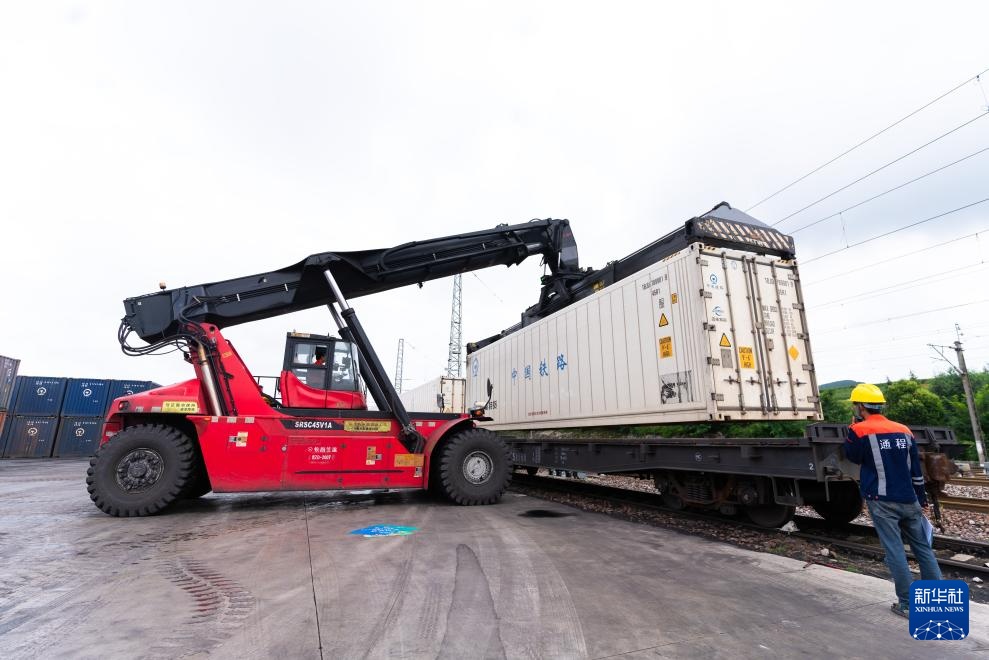 8月7日,工作人员在陆良站货场为“陆良蔬菜号”冷链班列装载集装箱。