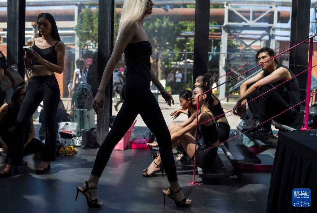 8月7日,在北京798·751园区举办的2025中国国际时装周(秋季)模特大面试上,模特在等待上场时走台步。