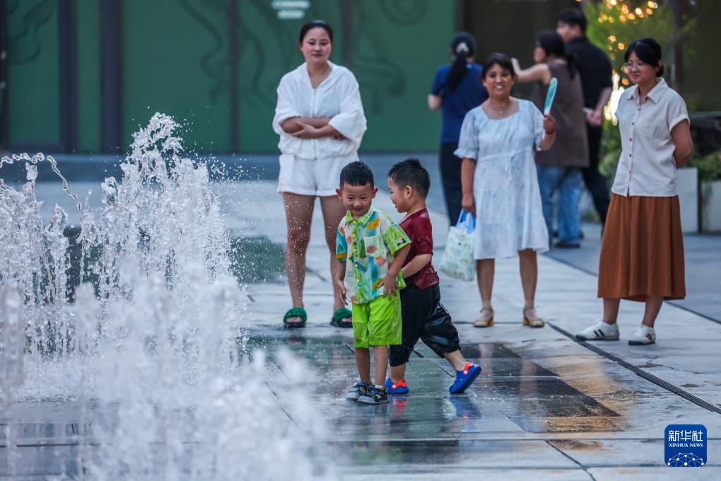8月7日,嘉兴市南湖区南湖天地商业街区,小朋友在喷泉广场嬉戏。