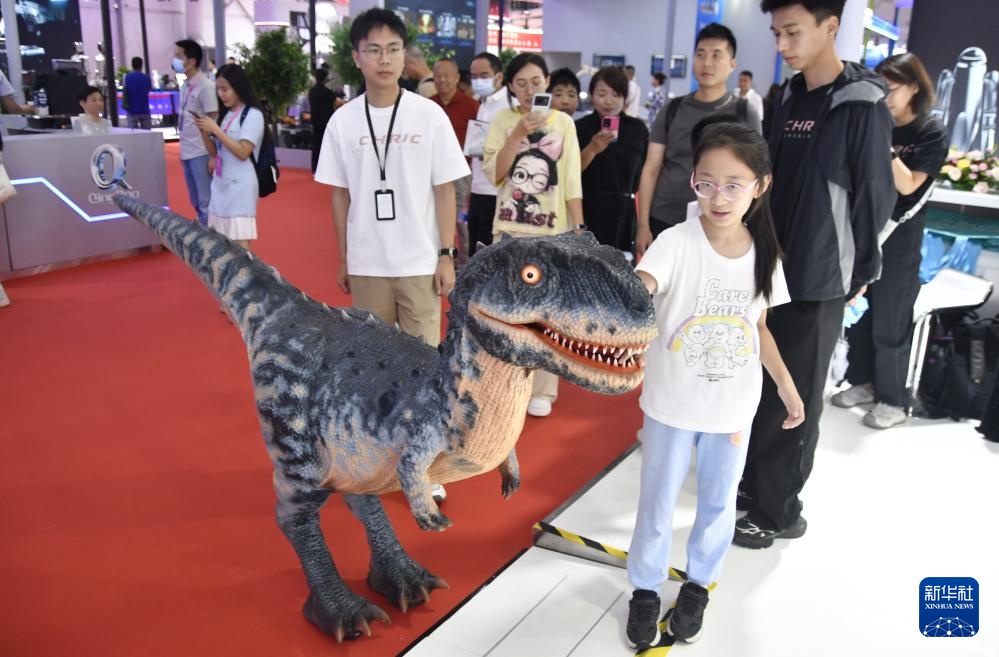 8月8日,观众在2025世界机器人大会现场与展出的仿真恐龙互动。