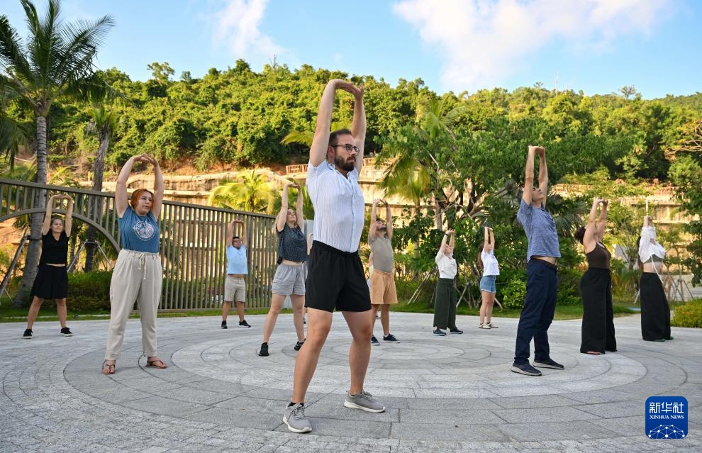 8月7日,外国学员在学习八段锦。