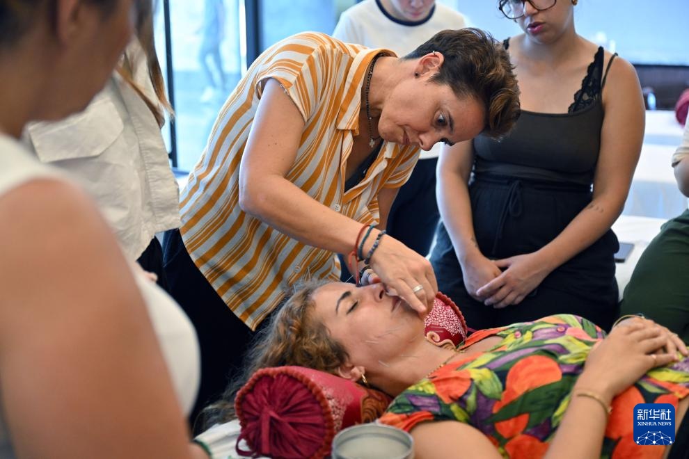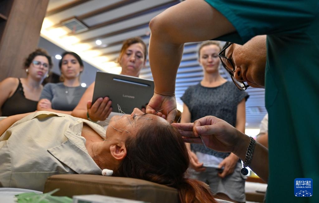 8月7日,外国学员在学习针灸。