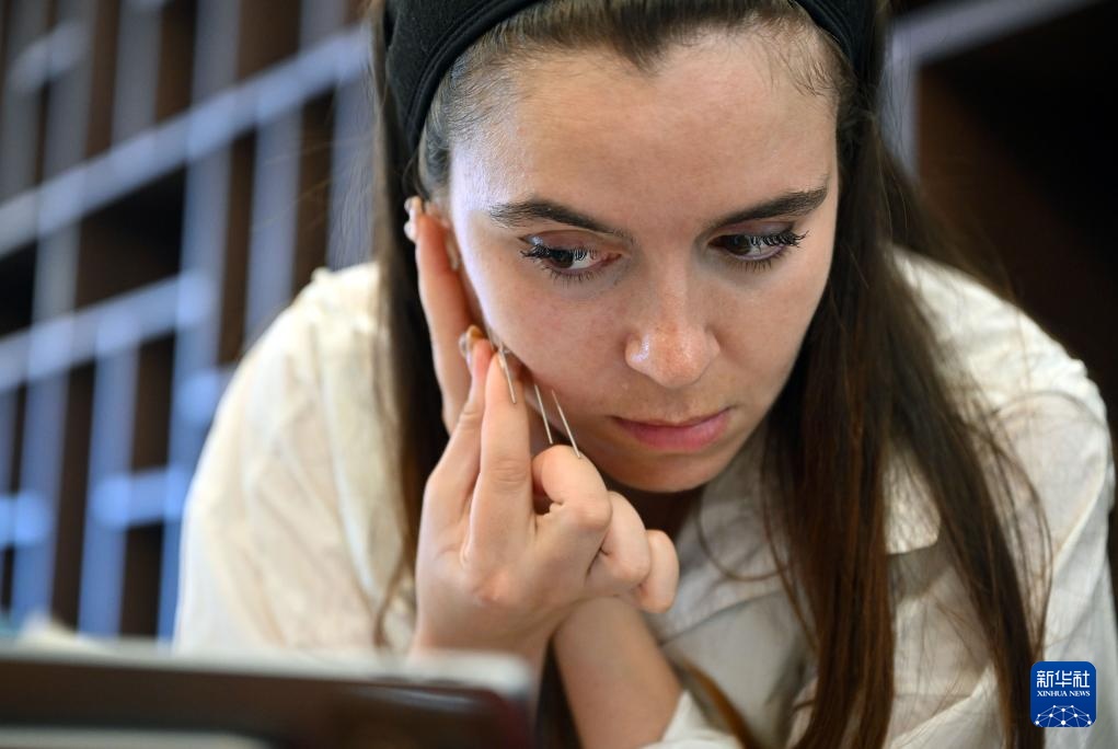 8月7日,外国学员在练习针灸。