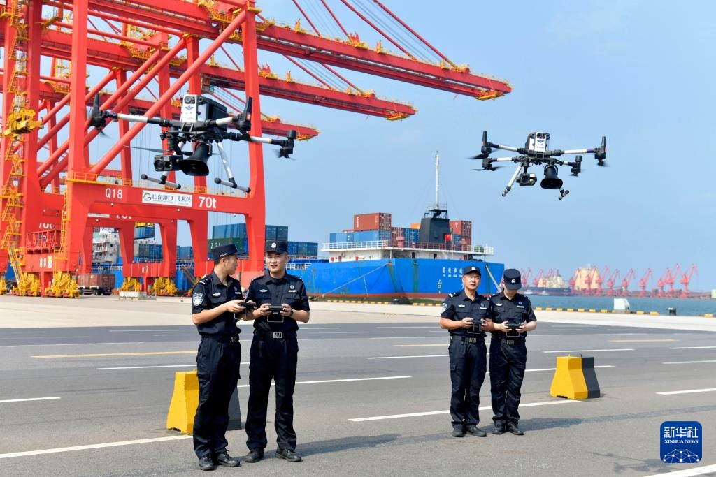 8月7日,在山东港口日照港,日照出入境边防检查站无人机警航队的民警起飞无人机进行巡查。
