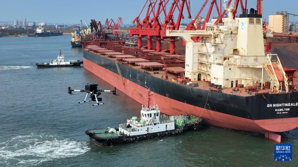 8月7日,在山东港口日照港,日照出入境边防检查站的警用无人机对抵港的巴拿马货轮进行巡查(无人机照片)。