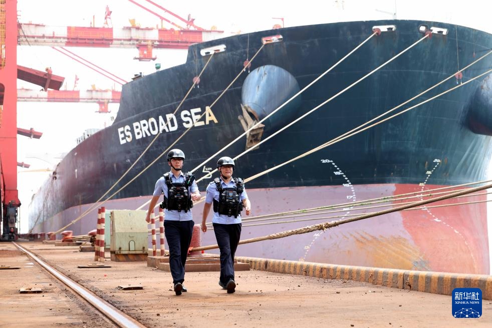8月8日,在山东港口日照港,日照出入境边防检查站民警穿戴智能头盔、云甲等警务装备开展巡查工作。
