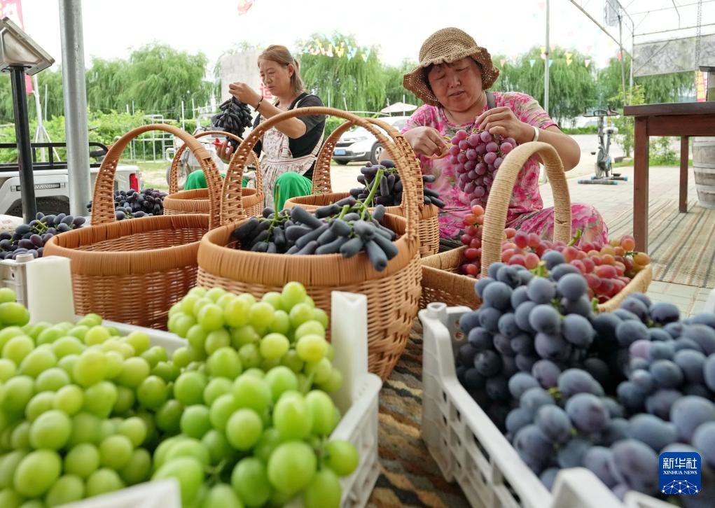 8月8日,果农在河北省昌黎县十里铺乡耿庄村蓝阔庄园分拣采摘的葡萄。