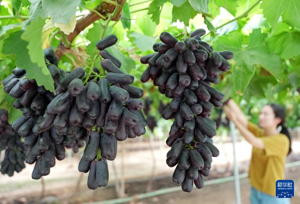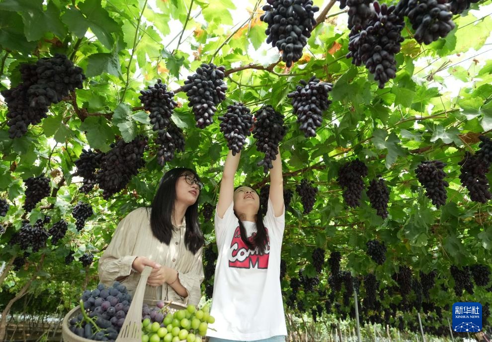 8月8日,游客在河北省昌黎县十里铺乡耿庄村蓝阔庄园采摘葡萄。