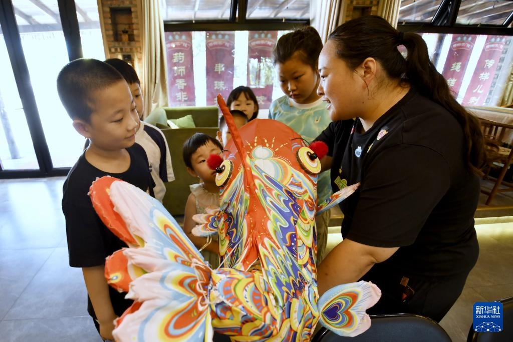 在怀柔区桥梓镇禧宝露文化中心,孩子们了解北京市级非物质文化遗产代表性项目沙燕吉祥鸟的制作技艺(8月6日摄)。