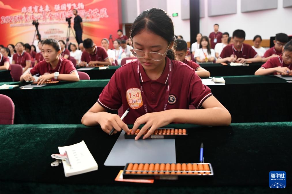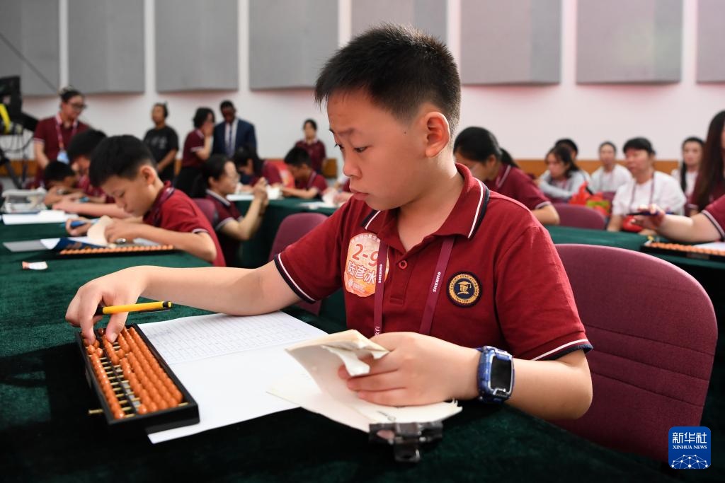 8月8日,参赛选手闫静涵在比赛开始前按照老师要求进行珠算热身。