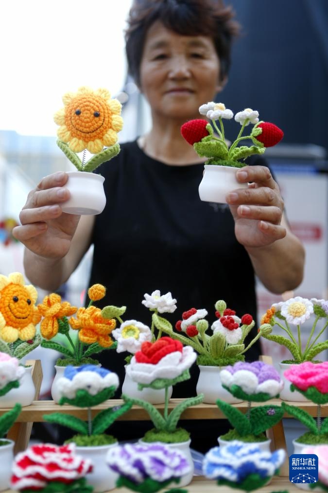 8月8日,一名摊贩在莱西市月湖步行街售卖手工编织摆件。