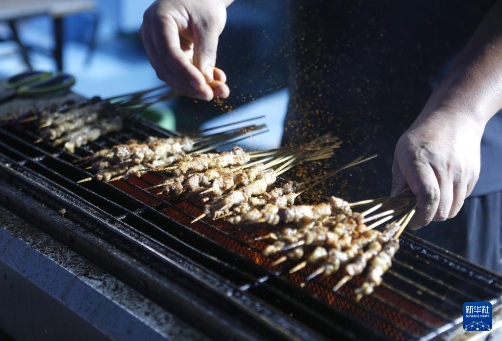 8月8日,摊主在莱西市月湖步行街烤肉串。