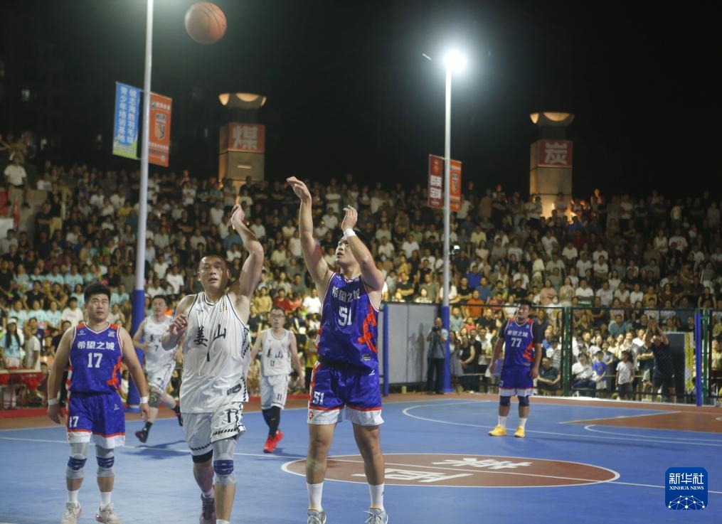 这是8月8日在莱西市人民广场拍摄的莱西市篮球联赛现场。