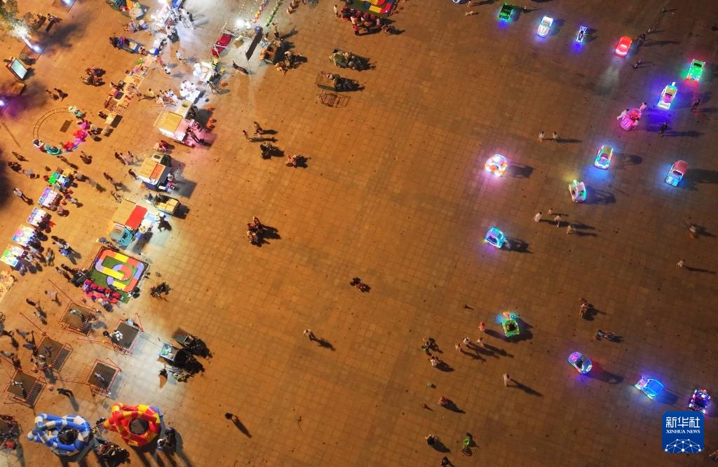 这是8月8日在莱西市人民广场拍摄的夜市(无人机照片)。