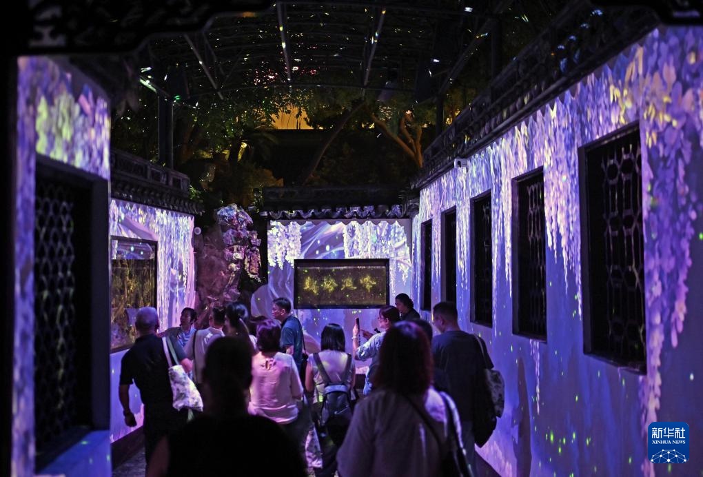 8月8日晚,人们在被光影点亮的“紫藤深境”游览。