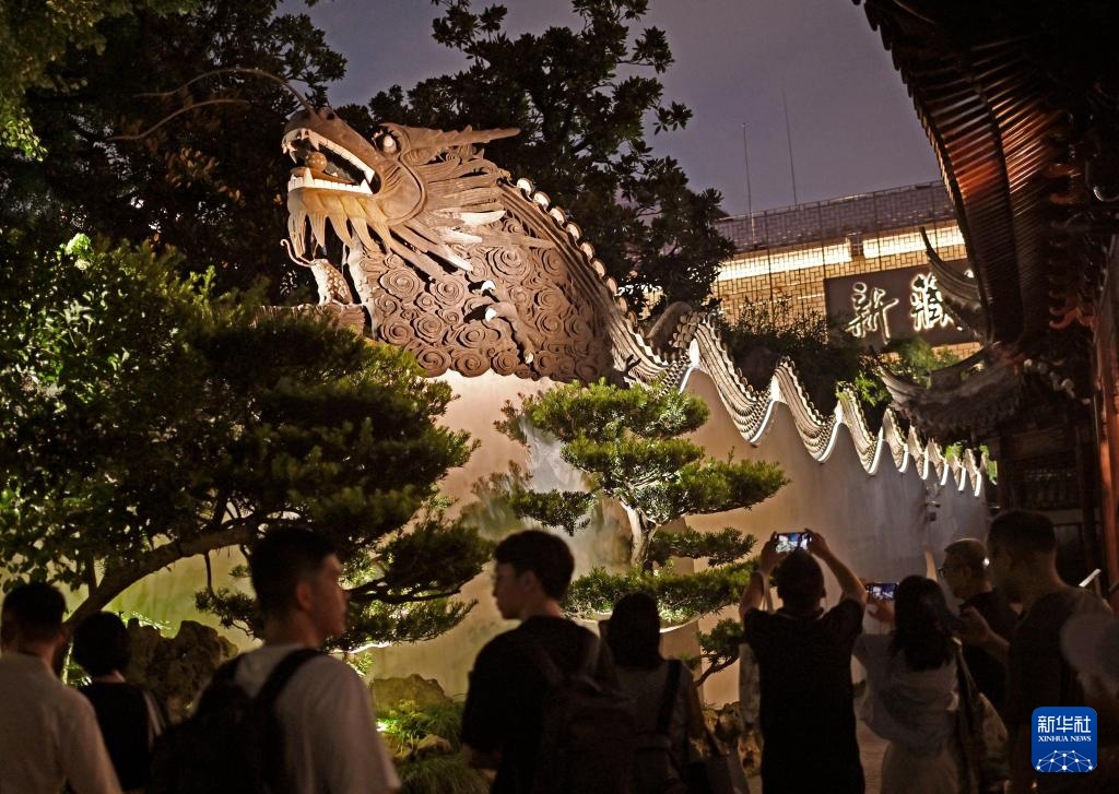 8月8日晚,人们在豫园的龙墙下游览拍摄。