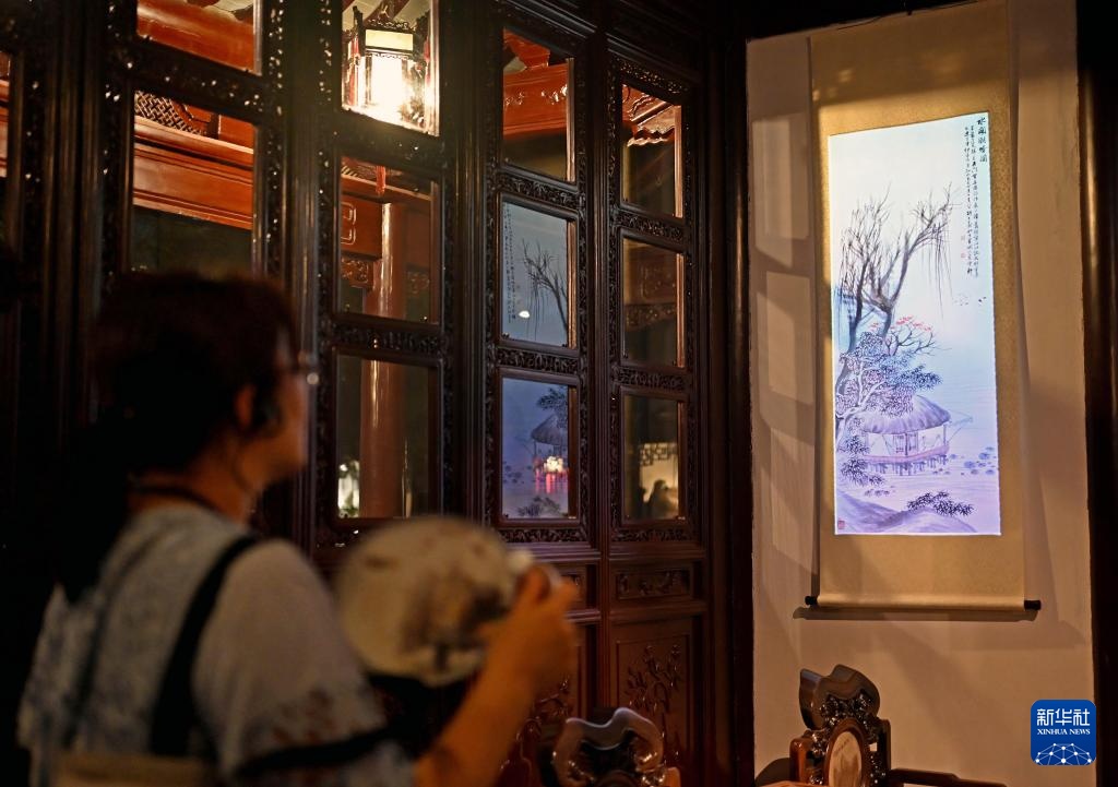 8月8日晚,人们在豫园欣赏通过数字技术展示的书画文物。